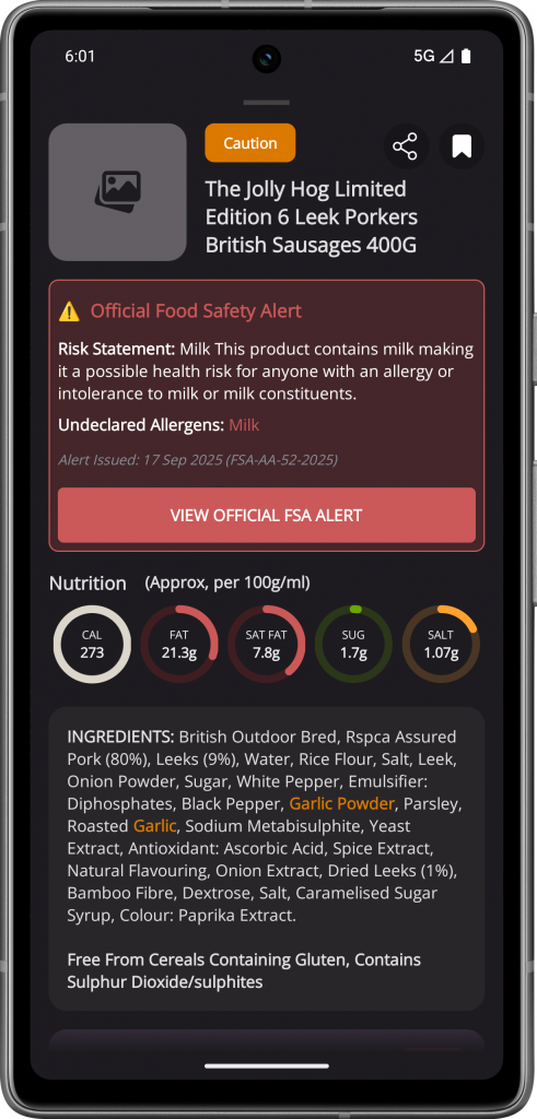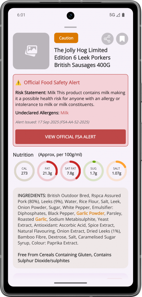 - On-Page Alerts: Any product in our database that is subject to an active FSA allergy alert will be clearly marked with an official warning, just like the one above. You’ll see the risk statement, the specific undeclared allergen, and a direct link to the official FSA announcement.